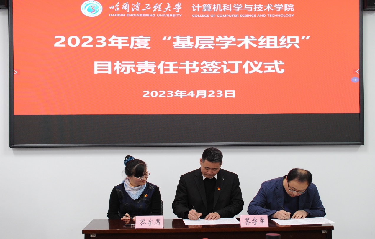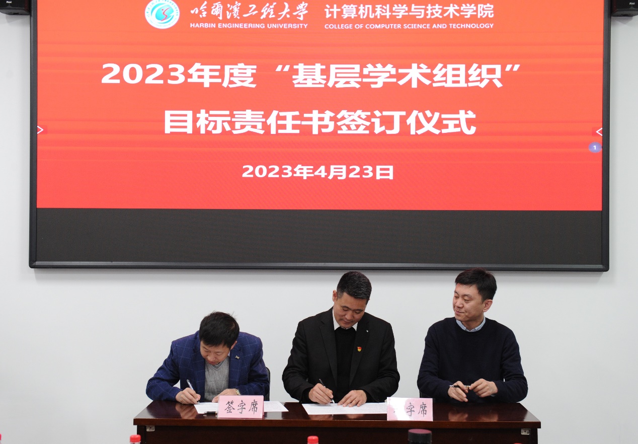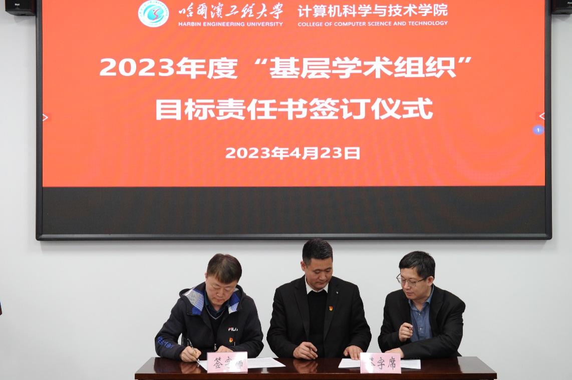 2023年4月23日11时15分,计算机科学与技术学院2023年度“基层学术组织”目标责任书签订仪式在21B楼4127会议室举行,院长蔡成涛分别与各基层学术组织主任及党支部书记签订目标责任书。
