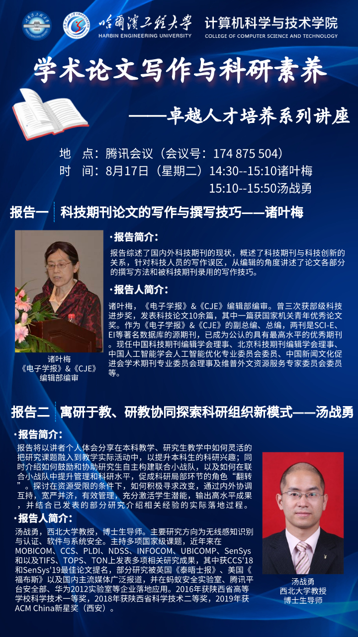 8月17日下午2:30,学院在线上组织开展题为“学术论文写作与科研素养”的卓越人才系列讲座,讲座邀请到《电子学报》&《CJE》编辑部总编,诸叶梅教授,以及西北大学博士生导师,汤战勇教授。