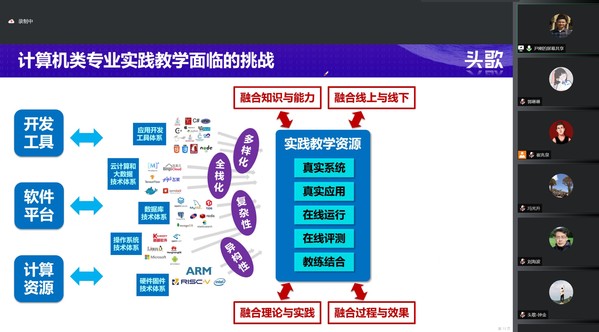 会上尹刚主任从高校教学挑战、创新平台建设和实践课程应用三方面展开,分析了课程建设要求,指出了计算机类专业实践教学面临的挑战,介绍了开放在线实践(MOOP)环境、案例开发过程、以及实践项目的在线课程教学方法与过程,提出了特色化示范性软件学院建设模型,简述了头歌实践教学平台及其生态,包括一流课程平台、实验教学平台、课程创新生态、新型教材实验、云际运行模式,介绍了高校专业课程建设场景与应用成效。